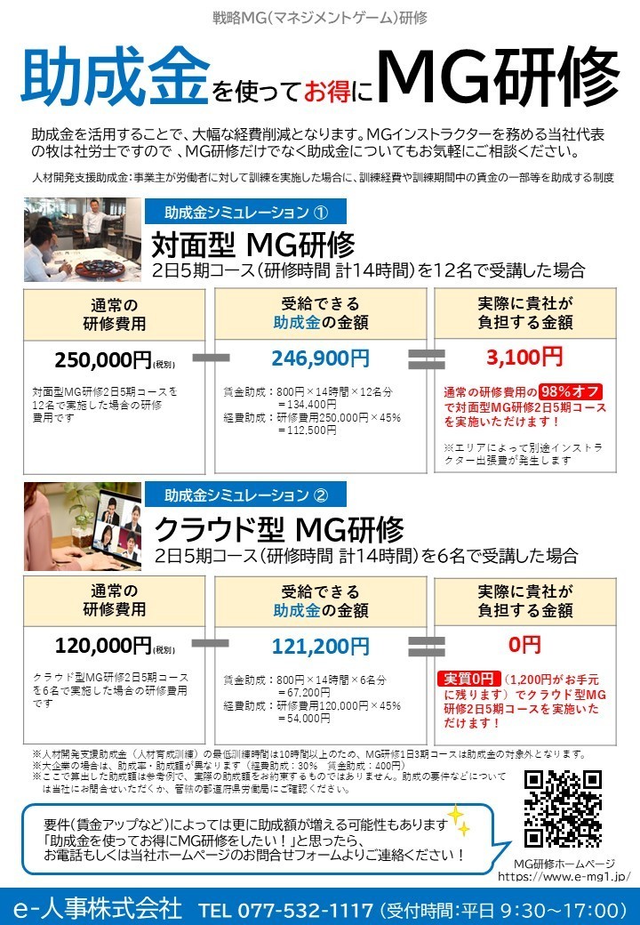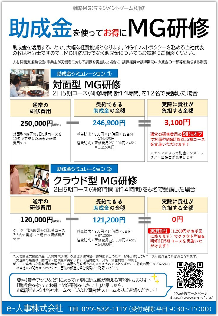 企業の社員研修として、また商工会や同友会の勉強会として、マネジメントゲームを使った『戦略MG研修』をおすすめします。